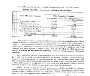 दोनवेळा झालेल्या अतिवृष्टीमुळे शेतकऱ्यांचे मोठ्या प्रमाणावर पीकाचे नुकसान झाले. त्याचबरोबर शेतकऱ्यांनी पीक विम्याचा हप्ता भरूनही पीक विमा कंपन्यांनी अद्याप त्यांची नुकसान भरपाई दिलेली नसल्याने अखेर राज्य सरकारने सहा पीक विमा कंपन्यांना दणका देत नोटीसा बजावत पीक विमा शेतकऱ्यांसाठीच असून तो दिवाळी पूर्वीच दिला जावा, असे निर्देश दिले.