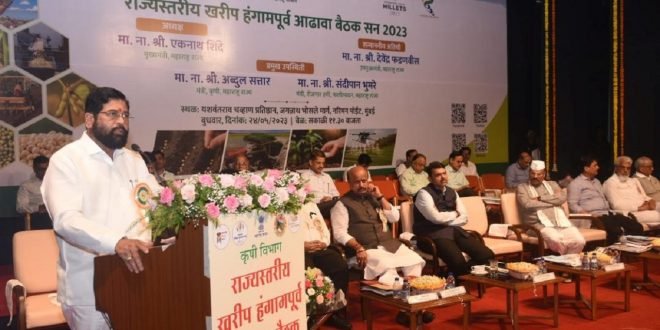 यशवंतराव चव्हाण प्रतिष्ठान सभागृहात आज सकाळी राज्यस्तरीय खरीप हंगामपूर्व आढावा बैठक २०२३ चे आयोजन करण्यात आले होते. त्यावेळी मुख्यमंत्री शिंदे हे अध्यक्षस्थानावरून बोलत होते. यावेळी उपमुख्यमंत्री देवेंद्र फडणवीस, कृषी मंत्री अब्दुल सत्तार, पाणीपुरवठा व स्वच्छता मंत्री गुलाबराव पाटील, रोजगार हमी व फलोत्पादन मंत्री संदिपान भुमरे, बंदरे व खनिकर्म मंत्री दादाजी भुसे, कामगार मंत्री डॉ. सुरेश खाडे, शालेय शिक्षण मंत्री दीपक केसरकर, सहकार मंत्री अतुल सावे, आमदार प्रकाश आबिटकर, मुख्य सचिव मनोज सौनिक, सहकार विभागाचे अपर मुख्य सचिव अनुपकुमार, कृषी विभागाचे प्रधान सचिव एकनाथ डवले, कृषी आयुक्त सुनील चव्हाण आदी उपस्थित होते.