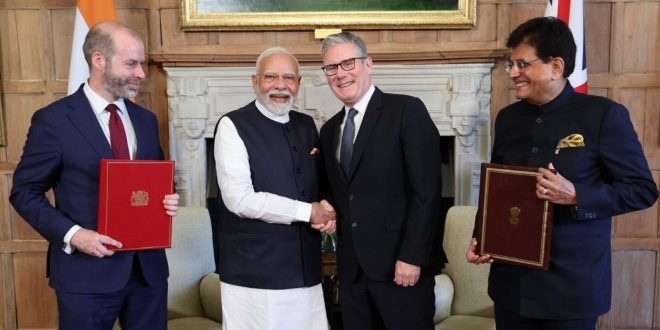 भारत आणि ब्रिटनने २४ जुलै रोजी व्यापक आर्थिक व्यापार करारावर स्वाक्षरी केली, ज्यासाठी वाटाघाटी या वर्षी मे महिन्यात पूर्ण झाल्या. पंतप्रधान नरेंद्र मोदी आणि पंतप्रधान केयर स्टारमर यांच्या उपस्थितीत वाणिज्य आणि उद्योग मंत्री पियुष गोयल आणि त्यांचे ब्रिटिश समकक्ष जोनाथन रेनॉल्ड्स यांनी स्वाक्षरी केलेल्या या कराराचे उद्दिष्ट २०३० पर्यंत द्विपक्षीय व्यापार सुमारे १३० अब्ज डॉलर्सपर्यंत दुप्पट करण्याचे आहे.