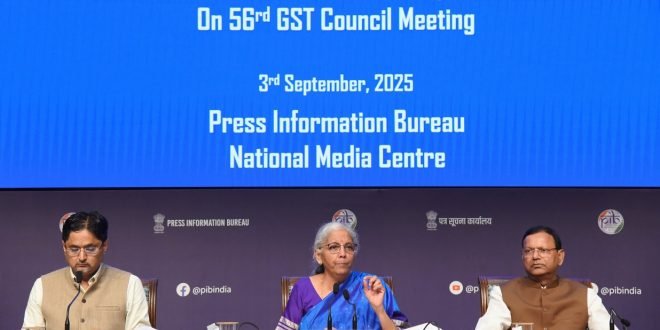 केंद्रीय अर्थमंत्री निर्मला सीतारमण यांच्या अध्यक्षतेखाली झालेल्या वस्तू आणि सेवा कर (जीएसटी) परिषदेने जीएसटी दर रचनेत महत्त्वपूर्ण बदलांना मान्यता दिली आहे ज्याचा उद्देश अनुपालन सुलभ करणे, कर स्लॅबचे तर्कसंगत करणे आणि घरे, मध्यमवर्ग आणि व्यवसायांना दिलासा देणे आहे.