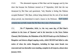 शिवसेना प्रवक्ते संजय राऊत यांनी आपल्याला धमकाविल्याचा आरोप कंगना राणावत हीने मुंबईला पाकव्याप्त काश्मीर संबोधले. तसेच मुख्यमंत्री उध्दव ठाकरे यांच्या विरोधात समाज माध्यमातून टीका करण्यास सुरुवात केली. त्यामुळे मुंबई महापालिकेने राणावतच्या अनधिकृत कार्यालयाच्या बांधकामाच्या विरोधात नोटीस बजावित बांधकाम तोडण्याची कारवाई केली.