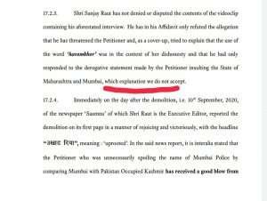 या नोटीसीच्या विरोधात राणावत हिने मुंबई उच्च न्यायालयात धाव घेतली. त्यावेळी संजय राऊत यांना त्यांनी केलेल्या वक्तव्याचे स्पष्टीकरण मागितले. तसेच कंगनालाही तीने मागितलेल्या वक्तव्यांची माहिती मागितली. त्यावेळी या दोघांनी सादर केलेल्या वक्तव्यांची तपासणी केली असता शिवसेना नेते राऊत यांचे वक्तव्य स्विकाहार्य नसल्याचे न्यायालयाने स्पष्ट केले. तर कंगना राणावत हीने आपल्या वक्तव्यांना आवर घालावा आणि अशी वक्तव्ये करणे टाळावे असे निर्देश देत त्या शब्दांच्या ऐवजी चांगल्या पध्दतीने सल्ला देता आला असता असे मत ही न्यायालयाने यावेळी नोंदविले.