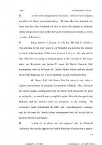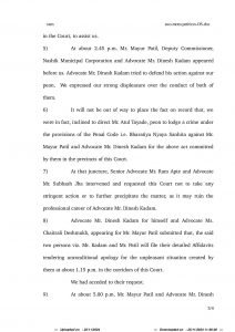 एका महापालिकेशी संबंधित एका प्रकरणावर सुनावणी सुरु असताना न्यायदालनात मोठ्या संख्येने वकील, पक्षकार उपस्थित होते. न्यायदालनाबाहेर गोँगाट ऐकू येत असल्याने नेहमीनुसार, शिपाईअतुल तायडे यांनी वकिल आणि उपस्थित अधिकाऱ्यांना शांतता राखण्यास सांगितले. त्यावर, अधिवक्ता दिनेश कदम यांच्यासह अधिकारी मयूर पाटील यांनी तायडे अश्लिल भाषेत शिवीगाळ करून मारण्याची तसेच त्याची तक्रार संबंधित अधिकाऱ्याकडे तक्रार करून संध्याकाळपर्यंत त्यांची सेवा समाप्त होईल, अशी धमकीही दिली. सदर बाब तायडे यांनी न्या. गडकरी यांच्या कानावर घातली असता न्यायालयाने कदम आणि पाटील या दोघांनाही जाब विचारला. त्यावर अँड. कदम यांनी आपली बाजू योग्य कशी ते सांगण्याचा प्रयत्न केला. त्यावर न्यायालयाने नाराजी व्यक्त केली. तुम्ही न्यायालयाने दिलेल्या आदेशाला चुकीचे ठरवत असून न्यायालयीन कर्मचाऱ्याला धमकावत आहात. याकृतीचे तुम्ही समर्थन करती आहात का?, अशा वागणूकीमुळे आम्ही तुमची सनद रद्द करू शकतो, अशा शब्दात न्यायालयाने सुनावले. न्यायालयाच्या वाढत्या नाराजीवरून ज्येष्ठ अँड. राम आपटे आणि अँड.सुभाष झा यांनी हस्तक्षेप करून कठोर कारवाईमुळे कदम यांच्या व्यावसायिक कारकिर्दीला हानी पोहोचू शकते, म्हणून न्यायालयाला सौम्यता दाखवावी, अशी विनंतीही केली. त्यावर सरकारी अधिकारी आणि वकीलाने न्यायालयाचीच नव्हे तर शिपायाचीही, संध्याकाळी ५:०० वाजेपर्यंत वैयक्तिक शपथपत्र सादर कऱण्याचे आदेश दिले