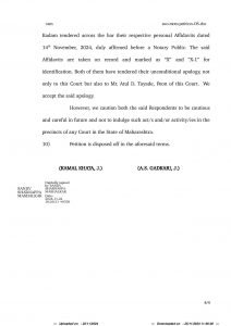 सरकारी अधिकारीमयूर गुलाबराव पाटील आणि आणि वकील अदिनेश निंबा कदम या दोघांनाही भविष्यात सावधगिरी बाळगण्याची आणि राज्यातील कोणत्याही न्यायालयाच्या न्यायदालनात अशी कृत्ये करू नयेत, असे आदेशही न्या. अजय गडकरी आणि न्या. कमल खाता यांच्या खंडपीठाने दोघांचाही माफीनामा स्वीकारताना आदेशात नमूद केले.