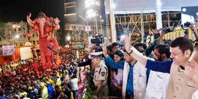 राज्य महोत्सवाच्या जल्लोषात गिरगाव चौपाटीवर गणरायाला निरोप मुख्यमंत्री फडणवीस यांच्या उपस्थितीत अनेक मंडळांनी निरोप दिला