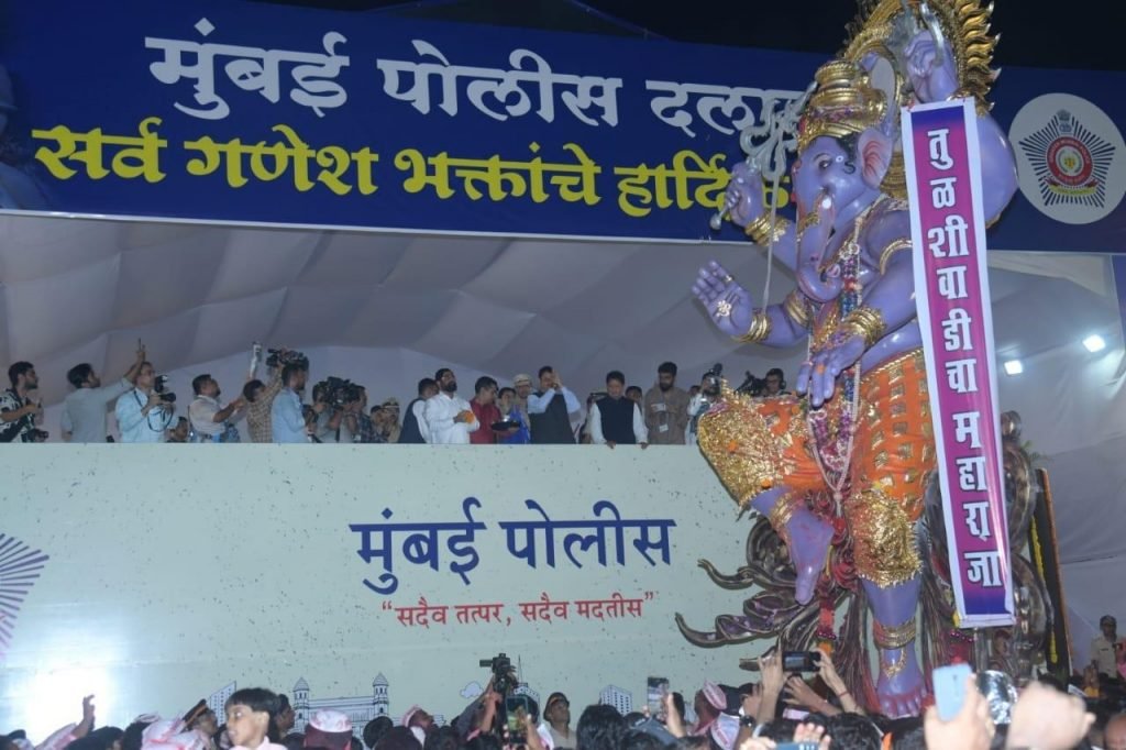 गिरगाव चौपाटीवर आज सायंकाळपासून भाविकांचा जनसागर जमला होता. दहा दिवसांच्या गणेशोत्सवानंतर आज अनंत चतुर्दशीच्या दिवशी गणरायांना भावपूर्ण निरोप देण्यात येत आहे. बृहन्मुंबई महानगरपालिकेमार्फत मुंबईत विविध ठिकाणी विसर्जनाची व्यवस्था करण्यात आली असून गिरगाव चौपाटी येथे मुख्यमंत्री एकनाथ शिंदे, उपमुख्यमंत्री देवेंद्र फडणवीस यांनी गणेश मूर्तींवर पुष्पवृष्टी करून गणरायांना निरोप दिला. मान्यवरांनी यावेळी उपस्थित असलेल्या विविध देशांच्या दूतावासाच्या प्रतिनिधींची भेट घेतली.