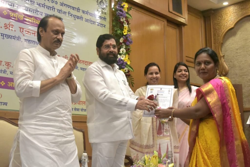 सह्याद्री अतिथीगृह येथे एकात्मिक बाल विकास सेवा योजनेंतर्गत भरती प्रक्रियेव्दारे नवनियुक्त झालेल्या १९ हजार ५७७ अंगणवाडी सेविका, मदतनीस यांच्यापैकी मुंबई शहर, उपनगर आणि ठाणे जिल्ह्यातील ५८ अंगणवाडी कर्मचारी यांना प्रातिनिधिक स्वरूपात नियुक्तीपत्र प्रदान करण्याच्या कार्यक्रमात मुख्यमंत्री शिंदे बोलत होते. यावेळी उपमुख्यमंत्री अजित पवार, महिला व बालविकास मंत्री आदिती तटकरे, महिला व बालविकास विभागाचे सचिव डॉ.अनुपकुमार यादव, एकात्मिक बाल विकास सेवा योजनेच्या आयुक्त रूबल अग्रवाल, महिला व बालविकास आयुक्त डॉ. प्रशांत नारनवरे, महिला व आर्थिक विकास महामंडळाच्या व्यवस्थापकीय संचालक डॉ. इंदू जाखड, स्माईल फाऊंडेशनच्या संचालक उमा आहुजा व धीरज आहुजा, मुंबई शहर, उपनगर आणि ठाणे जिल्ह्यातील ५८ नवनियुक्त अंगणवाडी कर्मचारी, अधिकारी उपस्थित होते.