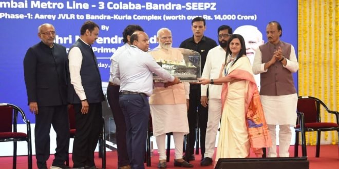 पंतप्रधान नरेंद्र मोदी यांच्या हस्ते मुंबईच्या वाहतुकीला गती देणाऱ्या मेट्रो ३ च्या पहिला टप्प्याचे लोकार्पण झाले.तसेच मुंबई व ठाणे परिसरातील ३२ हजार ८०० कोटी रुपयांच्या विविध नागरी विकास प्रकल्पांचे भूमिपूजन, आणि मुख्यमंत्री माझी लाडकी बहीण योजनेच्या लाभाचे वितरण करण्यात आले. पंतप्रधान मोदी यांनी बांद्रा-कुर्ला संकुल येथील मेट्रो स्टेशन येथे पहिल्या मेट्रोला हिरवा झेंडा दाखविला. यावेळी त्यांनी बीकेसी ते सांताक्रुज असा मेट्रो प्रवास केला. पंतप्रधान. मोदी यांनी प्रवासादरम्यान मेट्रोमध्ये ‘मुख्यमंत्री माझी लाडकी बहीण योजने’च्या लाभार्थी भगिनी आणि विद्यार्थी, मजूर यांच्याशी संवाद साधला.