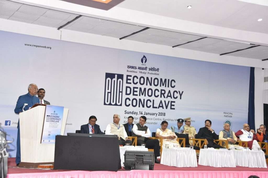 भाईंदर येथील उत्तन येथे रामभाऊ म्हाळगी प्रबोधिनी केंद्रात आयोजित आर्थिक जनतंत्र परिषद (इकोनॉमिक डेमोक्रॅसी कॉन्क्लेव्ह) चे उद्घाटन करतांना ते बोलत होते. या कार्यक्रमासाठी राष्ट्रपतींच्या पत्नी सविता, राज्यपाल डॉ. चे. विद्यासागर राव आणि मुख्यमंत्री देवेंद्र फडणवीस, केंद्रीय अर्थ राज्यमंत्री शिवप्रताप शुक्ला, डिक्कीचे अध्यक्ष मिलिंद कांबळे, नाबार्डचे अध्यक्ष हर्ष कुमार आदी उपस्थित होते.