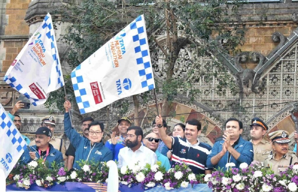 ‘टाटा मुंबई मॅरेथॉन 2023’ शर्यतींमधील विविध स्पर्धा प्रकारांना आज छत्रपती शिवाजी महाराज टर्मिनस येथून राज्यपाल भगत सिंह कोश्यारी, मुख्यमंत्री एकनाथ शिंदे, केंद्रीय मंत्री किरेन रिजिजू, उपमुख्यमंत्री देवेंद्र फडणवीस यांच्या हस्ते झेंडा दाखवून शुभारंभ करण्यात आला.