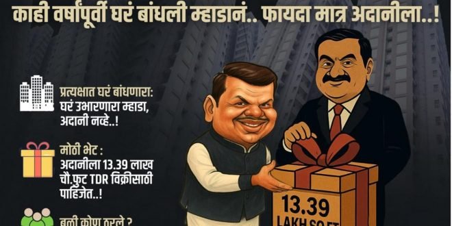 अदानीचा एक लाख कोटी रुपयांचा धारावी विनाश महाघोटाळा दिवसेंदिवस रौद्ररूप धारण करत आहे. या महाघोटाळ्याचा नवा अध्याय म्हणजे, अदानी सरकार अदानीला तब्बल १३.३९ लाख चौरस फूट विक्रीयोग्य क्षेत्र (sale incentive area) TDR स्वरूपात गिफ्ट देऊ इच्छित आहे. ते पण अशा पुनर्वसन घरांसाठी/ गाळ्यांसाठी, जे अदानीने बांधलेले देखील नाहीत, असे मुंबई काँग्रेस अध्यक्ष खासदार वर्षा गायकवाड यांनी सांगितले आहे.