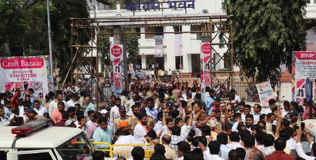 राज्यात वाद निर्माण करणाऱ्या हर्षवर्धन सपकाळ यांच्या विधानाचा निषेध करत भाजपा कार्यकर्त्यांनी काँग्रेस भवनाबाहेर निदर्शने केली असता परिसरात मोठा पोलिस बंदोबस्त तैनात करण्यात आला होता.