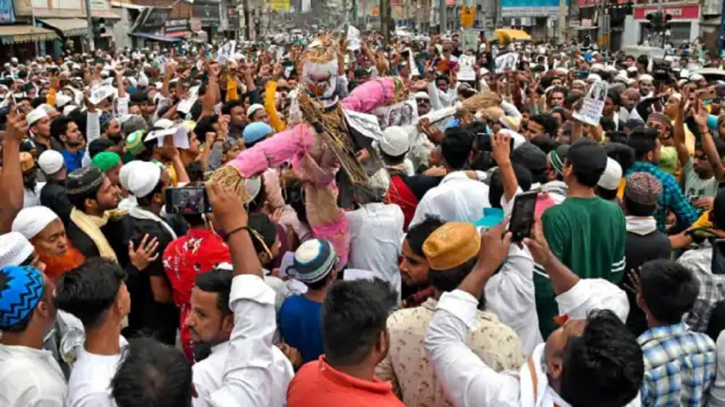 महाराष्ट्रातील औरंगाबाद आणि सोलापूरात देखील मुस्लीम समुदायाने एकत्र येत निदर्शने केली आहेत. औरंगाबादमधील विभागीय कार्यालयासमोर मुस्लीम बांधव हजारोंच्या संख्येनं जमले आहेत. येथे त्यांनी भाजपाच्या निलंबित प्रवक्त्या नुपूर शर्मा यांच्या विधानाचा निषेध केला. तर सोलापुरात देखील एमआयएम पक्षाने जिल्हाधिकारी कार्यालयावर मोर्चा काढला. या मोर्चाच्या माध्यमातून एमआयएमचे शक्तिप्रदर्शनही पाहायला मिळाले.