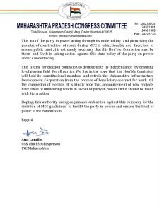 आदर्श आचारसंहिता लागू असताना सरकारी उपक्रम असलेल्या महामंडळाने रस्ते बांधण्याचे आश्वासन देणे आक्षेपार्ह आहे. जनतेचा विश्वास सुनिश्चित करणे हे निवडणूक आयोगाची जबाबदारी आहे. निवडणुक आयोगाने या प्रकरणात लक्ष घालून रस्ते बांधकामाची बोली रद्द करावी व महामंडळावर कठोर कारवाई करावी, असेही अतुल लोंढे म्हणाले.