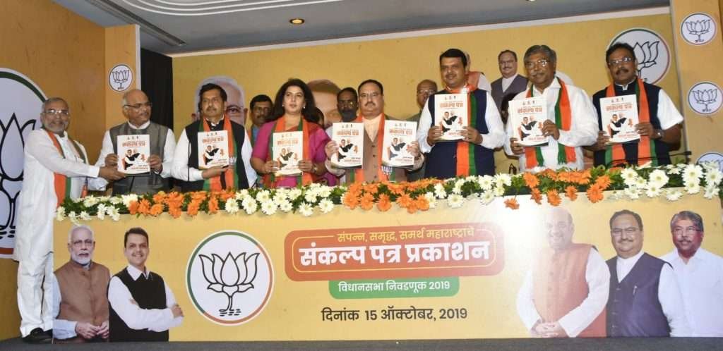 काँग्रेस-राष्ट्रवादी काँग्रेस, वंचित बहुजन आघाडी आणि शिवेसेनेचा जाहीरनामा प्रसिध्द झाल्यानंतर मतदानाला अवघ्या ५ ते ७ दिवस शिल्लक राहीलेले असताना भाजपाने आपला संकल्प पत्र अर्थात जाहीरनामा आज जाहीर केला. रंगशारदा येथे आयोजित कार्यक्रमाला मुख्यमंत्री देवेंद्र फडणवीस, प्रदेशाध्यक्ष चंद्रकांत पाटील, राष्ट्रीय कार्यकारी अध्यक्ष जे.पी.नड्डा, राज्याच्या प्रभारी सरोज पांडे यांच्यासह अनेक मान्यवर उपस्थित होते.