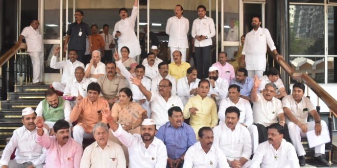 गली-गली में शोर है…भाजप सरकार चोर है…भाजप सरकार हाय हाय…अशा घोषणा देत आज हिवाळी अधिवेशनाच्या तिसऱ्या दिवशीही काँग्रेस, राष्ट्रवादी काँग्रेस आणि विरोधी पक्षाच्या आमदारांनी विधानभवनाच्या पायऱ्यांवर बसून सरकारच्याविरोधात जोरदार घोषणाबाजी केली.