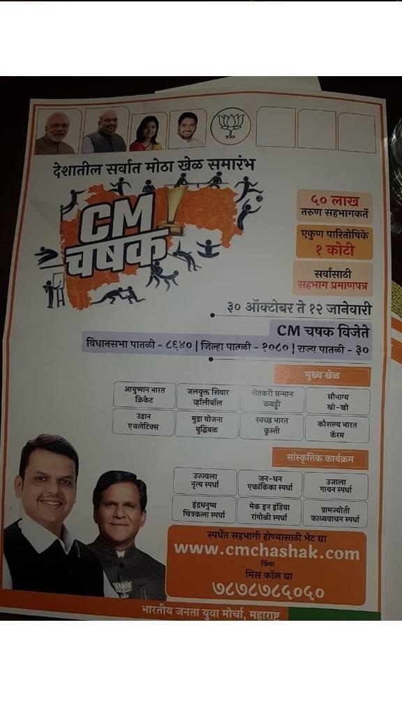 आगामी विधानसभा आणि लोकसभा निवडणूका नजरेसमोर ठेवत राज्यातील सर्वच राजकिय पक्षांनी तयारी करण्यास सुरुवात केली आहे. मात्र भाजपने या सर्व पक्षांवर मात करत भाजपच्या युवा मोर्चाकडून थेट ५० लाख तरूण मतदारांशी संपर्क करण्यासाठी आणि शासकिय योजना लोकांपर्यंत पोहोचविण्यासाठी मुख्यमंत्री चषक स्पर्धेतंर्गत शासकीय योजनांच्या नावावर आधारीत आयुष्यमान क्रिकेट ते स्वच्छ भारत कुस्ती स्पर्धांचे आयोजन केले. ही स्पर्धा राज्यातील २८८ विधानसभा मतदारसंघात खेळली जाणार असून ही स्पर्धा ७५ दिवस चालणार आहे.