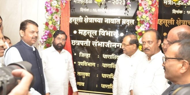 यावेळी छत्रपती संभाजीनगर महसुली विभाग आणि धाराशिव जिल्हा, तालुका, गाव या नामकरण फलकाचे अनावरण मुख्यमंत्री शिंदे, उपमुख्यमंत्री फडणवीस, उपमुख्यमंत्री पवार यांच्या हस्ते झाले. यावेळी दिलेल्या छत्रपती शिवाजी महाराज की जय… छत्रपती संभाजी महाराज की जय या जयघोषामुळे परिसर दुमदुमला.
