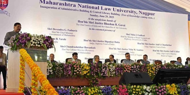 वारंगा (नागपूर) येथील महाराष्ट्र राष्ट्रीय विधी विद्यापीठाच्या नवीन प्रशासकीय इमारतीचे उद्घाटन आणि ग्रंथालयाच्या इमारतीचे भूमिपूजन आज सरन्यायाधीश भूषण गवई यांच्या हस्ते झाले. त्यावेळी ते बोलत होते. राज्याचे मुख्यमंत्री देवेंद्र फडणवीस, केंद्रीय मंत्री नितीन गडकरी यांच्यासह सर्वोच्च न्यायालयाचे न्यायमूर्ती दीपांकर दत्ता, न्या. प्रसन्न वराळे, न्या. अतुल चांदूरकर, मुंबई उच्च न्यायालयाचे मुख्य न्यायमूर्ती तथा विद्यापीठाचे प्रकुलगुरू न्या. आलोक आराधे, नागपूर खंडपीठाचे प्रशासकीय प्रमुख न्या. नितीन सांबरे, न्या.भारती डांगरे, न्या. अनिल किलोर, सर्वोच्च न्यायालयाचे माजी न्यायमूर्ती विकास सिरपूरकर, देशाचे सॉलिसिटर जनरल ॲड. तुषार मेहता, महाधिवक्ता डॉ. बीरेंद्र सराफ, विद्यापीठाचे कुलगुरू विजेंदर कुमार, विद्यापीठाच्या कुलसचिव रागिणी खुबाळकर आदी व्यासपीठावर उपस्थित होते.