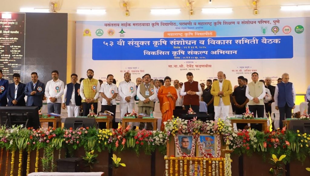 परभणी येथील वसंतराव नाईक मराठवाडा कृषि विद्यापीठ आणि महाराष्ट्र कृषि शिक्षण व संशोधन परिषदेच्यावतीने आयोजित संयुक्त कृषि संशोधन आणि विकास समितीच्या ५३ व्या बैठकीचे उद्घाटन मुख्यमंत्री फडणवीस यांच्या हस्ते झाले. कृषिमंत्री ॲड. माणिकराव कोकाटे, कृषी राज्यमंत्री ॲड. आशिष जयस्वाल, पालकमंत्री मेघना बोर्डीकर, खासदार संजय जाधव, आमदार सर्वश्री सतीश चव्हाण, राहुल पाटील, रत्नाकर गुट्टे, राजेश विटेकर यांच्यासह कृषि शिक्षण व संशोधन परिषदेचे उपाध्यक्ष तुषार पवार, कृषी विभागाचे प्रधान सचिव विकासचंद्र रस्तोगी, कृषि आयुक्त सुरज मांढरे, वसंतराव नाईक मराठवाडा कृषि विद्यापिठाचे कुलगुरू डॉ. इंन्द्र मणि, डॉ. पंजाबराव देशमुख कृषि विद्यापीठाचे कुलगुरू डॉ. शरद गडाख, बाळासाहेब सावंत कोकण कृषि विद्यापिठाचे कुलगुरू डॉ. संजय भावे, जिल्हाधिकारी रघुनाथ गावडे, संशोधक संचालक डॉ. खिजर बेग, डॉ. किशोर शिंदे उपस्थित होते. प्रारंभी स्वर्गीय वसंतराव नाईक, महाराणा प्रताप यांच्या प्रतिमेचे पूजन करून अभिवादन करण्यात आले.