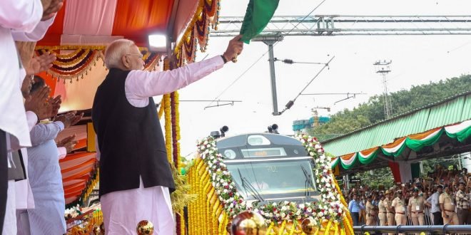 पंतप्रधान नरेंद्र मोदी यांच्या हस्ते आज दूरदृश्य संवाद प्रणालीद्वारे नागपूर-पुणे वंदे भारत एक्सप्रेसचा हिरवा झेंडा दाखवून शुभारंभ करण्यात आला. या निमित्ताने येथील मध्यवर्ती रेल्वे स्थानकाच्या फलाट क्रमांक आठवर आयोजित करण्यात आलेल्या कार्यक्रमास राज्याचे मुख्यमंत्री देवेंद्र फडणवीस व केंद्रीय परिवहन मंत्री नितीन गडकरी यांची प्रमुख उपस्थिती होती.