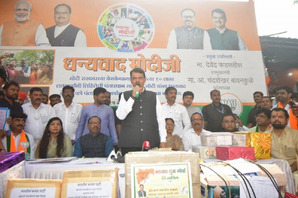 फडणवीस म्हणाले की, गरीब कल्याणाच्या कार्यक्रमाबाबत पूर्वीही देशात बोलले जात असे, मात्र हे कार्यक्रम कधी प्रत्यक्षात आले नव्हते. मोदी सरकारने गरीब कल्याण हे एकमेव उद्दिष्ट ठेवून अनेक योजना सुरु केल्या. एक पैशाचाही भ्रष्टाचार न होता या योजनांचे लाभ गोरगरीबांपर्यंत पोहचत आहेत. धर्म, जात, पंथ न पाहता गरीबांपर्यंत कल्याणकारी योजनांचे लाभ पोहचविले जात आहेत. वेगवेगळ्या योजनेच्या लाभार्थ्यांची पत्रे पंतप्रधान नरेंद्र मोदी यांना पाठवण्याचा प्रदेश भाजपाचा उपक्रम अभिनंदनीय आहे. प्रदेश भाजपाने ठरवलेले अडीच कोटी लाभार्थ्यांची पत्रे पाठवण्याचे उद्दिष्ट निर्धारित मुदतीत साध्य करण्यासाठी कार्यकर्त्यांनी त्वरेने कार्यरत व्हावे असेही फडणवीस म्हणाले.