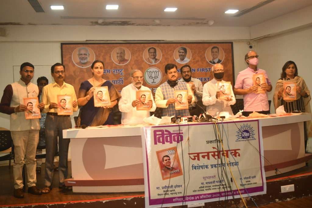 माजी मुख्यमंत्री आणि विरोधी पक्ष नेते देवेंद्र फडणवीस यांच्या कार्यकर्तृत्वाला उजाळा देणारे तसेच कोरोनोच्या कार्यकाळात त्यांनी केलेल्या सेवाकार्याचा समावेश असलेल्या ‘जनसेवक‘ या विशेषांकाचे प्रकाशन आज विरोधी पक्ष नेते प्रविण दरेकर यांच्या हस्ते व भाजपा महाराष्ट्राचे उपाध्यक्ष तसेच जनसेवक विशेषांकाचे अतिथी संपादक माधव भांडारी यांच्या प्रमुख उपस्थितीत झाले. याप्रसंगी भाजपाच्या नेत्या चित्रा वाघ, हिन्दुस्थान प्रकाशन संस्थेचे अध्यक्ष रमेश पतंगे, भाजपाचे मुख्य प्रवक्ते विश्वास पाठक, दिपाली मोकाशी, रविंद्र गोळे आदी मान्यवर उपस्थित होते. भाजपा महाराष्ट्र प्रदेश कार्यालयात विवेक साप्ताहिक प्रकाशित ‘जनसेवक‘ विशेषांक सोहळा पार पडला.