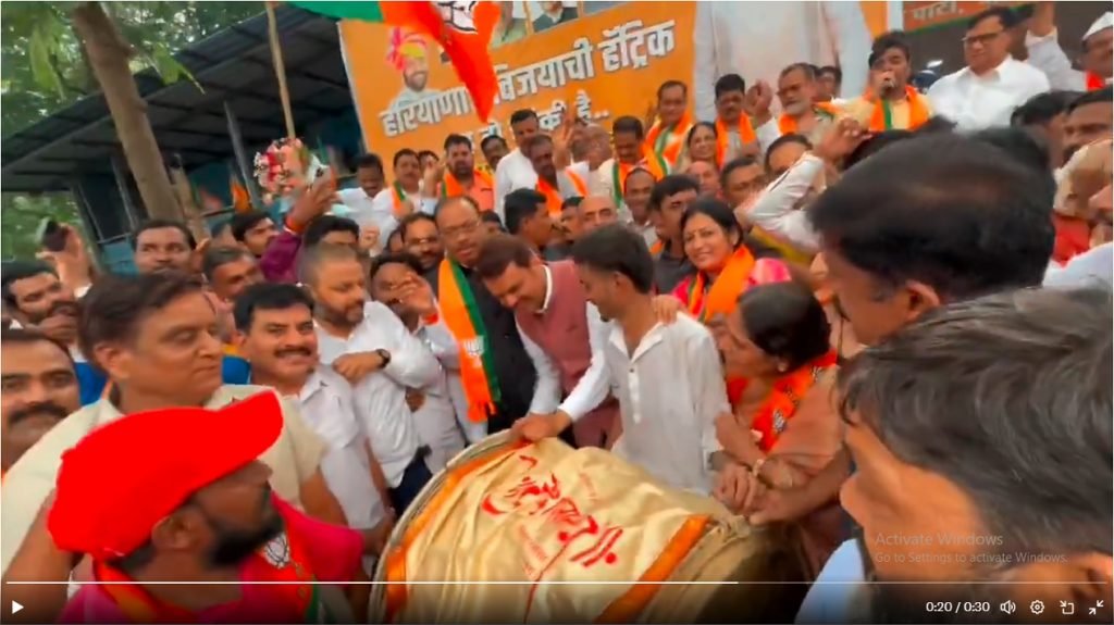हरियाणातील विजयावर शिक्कामोर्तब झाल्यानंतर भाजपाच्या महाराष्ट्र प्रदेश कार्यालयाबाहेर कार्यकर्त्यांची एकच गर्दी झाली. यावेळी राज्याचे उपमुख्यमंत्री देवेंद्र फडणवीस हे ही या विजयी मेळाव्यात सहभागी झाली.
