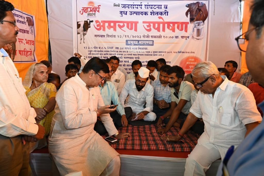 दुधाला ३४ रुपये भाव मिळावा या मागणीसाठी उपोषणाला बसलेल्या संदीप दराडे, कॉम्रेड डॉ अजित नवले आणि सहकाऱ्यांची आज काँग्रेस विधिमंडळ पक्षाचे नेते बाळासाहेब थोरात यांनी भेट घेतली, उपोषणकर्त्यांनी उपोषण मागे घेण्याची ही त्यांनी विनंती केली.
