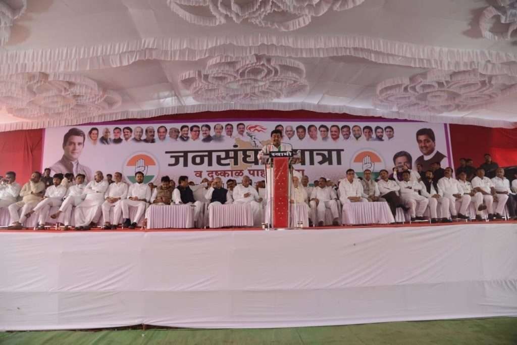 काँग्रेस पक्षाच्या जनसंघर्ष यात्रेचा तिसरा टप्पा व दुष्काळ पाहणी दौऱ्याचा प्रारंभ करताना औसा येथील पहिल्या जाहीर सभेत ते बोलत होते. याप्रसंगी काँग्रेसचे प्रदेशाध्यक्ष खा. अशोक चव्हाण, माजी केंद्रीय गृहमंत्री शिवराज पाटील, माजी केंद्रीय गृहमंत्री व माजी मुख्यमंत्री सुशीलकुमार शिंदे, माजी मुख्यमंत्री पृथ्वीराज चव्हाण, माजी मंत्री आ. बाळासाहेब थोरात, आ. मधुकरराव चव्हाण, आ. नसीम खान, हर्षवर्धन पाटील, आ. अमित देशमुख, आ. बसवराज पाटील, आ. त्र्यंबक भिसे, आ. सुनिल केदार, अखिल भारतीय काँग्रेस कमिटीचे सचिव व महाराष्ट्राचे सहप्रभारी आशिष दुआ, महाराष्ट्र प्रदेश काँग्रेस कमिटीच्या अनुसूचित जाती विभागाचे अध्यक्ष डॉ. राजू वाघमारे, सेवादलाचे प्रदेशाध्यक्ष विलास औताडे, युवक काँग्रेसचे प्रदेशाध्यक्ष सत्यजित तांबे, युवक नेते धीरज देशमुख, लातूर जिल्हा काँग्रेस कमिटीचे अध्यक्ष व्यंकट बेद्रे आदी नेते प्रामुख्याने उपस्थित होते. तत्पूर्वी खा. अशोक चव्हाण व अन्य प्रमुख नेत्यांनी तुळजापूर येथे आई भवानीचा आशीर्वाद घेतला व त्यानंतर औसा येथील भरगच्च सभेला संबोधित केले. औसा येथील सभा संपल्यानंतर काँग्रेस प्रदेशाध्यक्ष व इतर नेत्यांनी तालुक्यातील चलबुर्गा येथे दुष्काळग्रस्त शेतकऱ्यांशी संवाद साधला. यावेळी त्यांनी शेतकऱ्यांशी चर्चा करून त्यांच्या व्यथा जाणून घेतल्या.