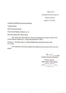 मध्य रेल्वे मुंबई विभागाच्या सहायक विभागीय अभियंत्यांनी दादर येथील मध्य रेल्वे प्लॅटफॉर्म क्रमांक १२ च्या पूर्वेकडील आरपीएफ ऑफिसच्या मागे असलेल्या अनधिकृत मंदिराला ७ दिवसांची नोटीस कार्यालयीन पत्र क्रमांक