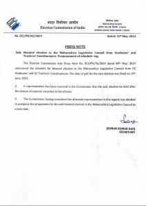शिक्षक आमदारकीची निवडणूक १० जूनला जाहीर झाल्यामुळे लोकसभेची निवडणूक ड्यूटी आटोपून सुट्टीवर जाणाऱ्या शिक्षकांच्या आनंदावर विरजण पडलं होतं. अखेर आनंदाची बातमी आली आहे. निवडणूक आयोगाने जाहीर कार्यक्रम तूर्त मागे घेतला आहे. शिक्षक भारतीचे कार्याध्यक्ष सुभाष किसन मोरे यांनी आमदार कपिल पाटील यांच्या सोबत दिल्लीत जाऊन भारत निर्वाचन आयोगाकडे मागणी केली होती तर हायकोर्टात याचिकाही केली होती. भारत निर्वाचन आयोगाने याबाबतची प्रेस नोट जारी केली आहे.