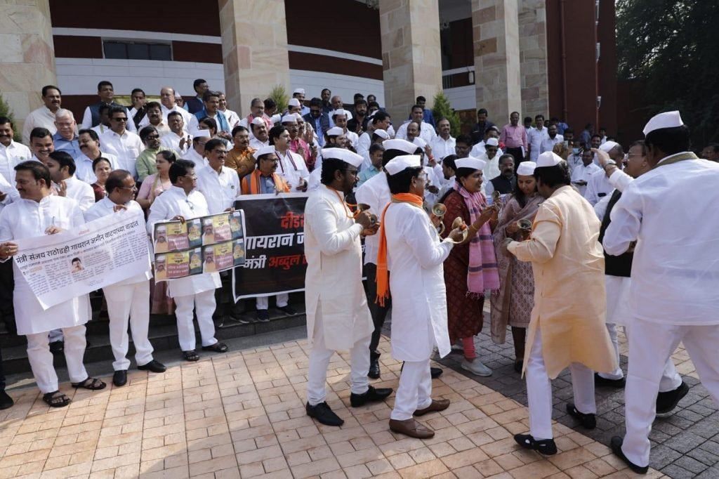 आज अधिवेशनाचा सातवा दिवस असून विरोधी पक्षनेते अजित पवार आणि अंबादास दानवे यांच्या नेतृत्वाखाली महाविकास आघाडीच्या आमदारांनी ईडी सरकारमधील मंत्र्यांच्या विरोधात जोरदार निदर्शने केली. विधानपरिषदेच्या आवारातून ही दिंडी विधानसभेच्या पायर्यांवर काढण्यात आली. टाळच्या आवाजाने विधानभवनाचा परिसर दणाणून सोडला.