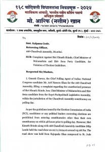 मुख्यमंत्री एकनाथ शिंदेंच्या विरोधात आचारसंहिता भंग प्रकरणी गुन्हा दाखल करा मविआचे चांदिवलीचे उमेदवार नसीन खान यांच्या मुख्य पोलींग एजंटची निवडणूक आयोगाकडे तक्रार