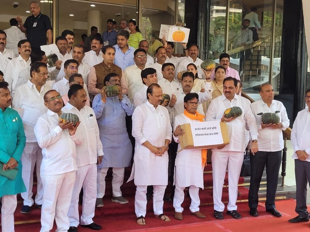 राष्ट्रवादीचे आमदार भोपळा डोक्यावर घेऊनच शिंदे सरकारच्या विरोधात जोरदार घोषणाबाजी करत विधानभवनाच्या परिसरात दाखल झाले. त्यानंतर पायर्यांवर आंदोलन केले.