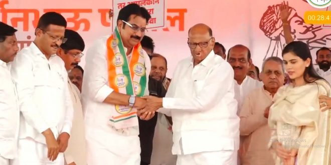 इंदापूर येथील मार्केट कमिटीच्या मोकळ्या जागेत राष्ट्रवादी काँग्रेस शरदचंद्र पवार पक्षाचे प्रमुख शरद पवार यांच्या प्रमुख उपस्थितीत आणि प्रदेशाध्यक्ष जयंत पाटील यांच्या उपस्थितीत हर्षवर्धन पाटील यांच्या पक्ष प्रवेशाचा सोहळ्याचा कार्यक्रम आयोजित करण्यात आला. यावेळी शरद पवार यांनी हर्षवर्धन पाटील यांच्या गळ्यात तुतारी असलेले पक्षाचे चिन्ह असलेले उपरणे हर्षवर्धन पाटील यांच्या गळ्यात घालत त्यांना पक्षात प्रवेश दिला.