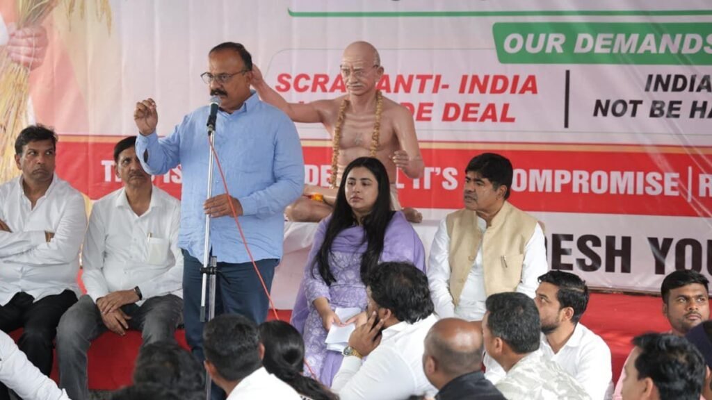 यावेळी हर्षवर्धन सपकाळ म्हणाले की, भारत हा कृषीप्रधान देश आहे पण भाजपाच्या राजवटीत देशातील अन्नदाता देशोधडीला लागला आहे. सत्तेत येण्यापूर्वी शेतकऱ्यांना दिलेली आश्वासने मोदी सरकारने पूर्ण केली नाहीत. शेतमालाला दुप्पट भाव तर मिळत नाहीच उलट शेतीसाठी लागणारा खर्च मात्र दुप्पट, तिप्पट वाढला आहे. नरेंद्र मोदींनी दबावाखाली अमेरिकेशी व्यापार करार केला असून ट्रम्पच्या धमकीला मोदी घाबरतात. या करारामुळे शेतकऱ्यांचे कंबरडे मोडले आहे. देशातील तरूण, कामगार, कष्टकरी, शेतकरी, सर्वांची नरेंद्र मोदी यांनी फसवणूक केली आहे. विकासाचा दावा करणारे मोदी सरकार देशाला विनाशाकडे घेऊन जात आहे.