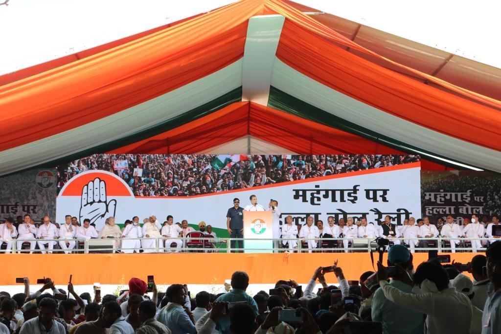 पंतप्रधान मोदी सातत्याने म्हणतात मागील ७० वर्षात काँग्रेसने काय दिले? पण काँग्रेसने इतकी महागाई कधी दिली नव्हती. देशाला रोजगार देणाऱ्या अर्थव्यवस्थेचा कणा भाजपाने मोडला आहे. नरेंद्र मोदी हे पंतप्रधान झाले ते फक्त त्या दोन उद्योगपतींच्या पाठबळावर. त्यामुळे नरेंद्र मोदी हे फक्त या दोन उद्योगपतींसाठी काम करतात आणि ते उद्योगपतीही त्यांच्यासाठी काम करतात असा आरोप राहुल गांधी यांनी केला.