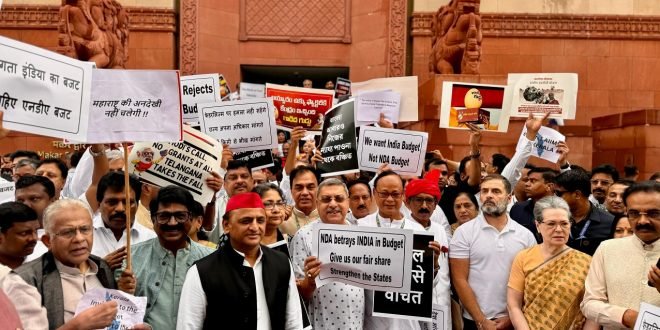 केंद्रीय अर्थसंकल्पाच्या विरोधात इंडिया आघाडीचे संसद आवारात निदर्शने अर्थसंकल्पात अनेक राज्यांकडे दुर्लक्ष