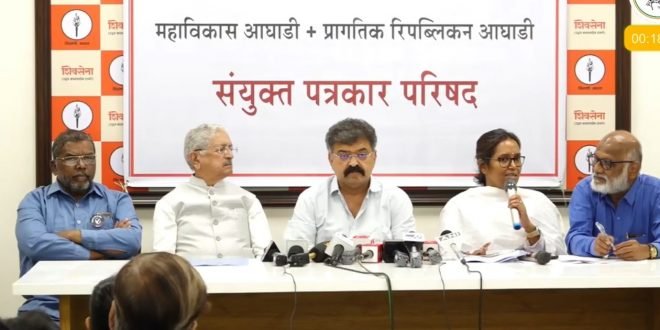 राज्यातील महाविकास आघाडी आणि प्रागतिक रिपब्लिकन आघाडी यांच्या संयुक्त पत्रकार परिषदेत जितेंद्र आव्हाड हे बोलत होते. यावेळी या पत्रकार परिषदेस शिवसेना उबाठाचे नेते सुभाष देसाई, मुंबई काँग्रेसच्या अध्यक्षा वर्षा गायकवाड, यांच्यासह प्रागतिक रिपब्लिकन आघाडीचे श्याम गायकवाड, डेमोक्रॅटिक रिपब्लिकन आघाडीचे प्रा. सुकुमार कांबळे उपस्थित होते. तसेच माजी डिआयजी सुधाकर सुराडकर, सुनिल खोब्रागडे हे ही उपस्थित होते.