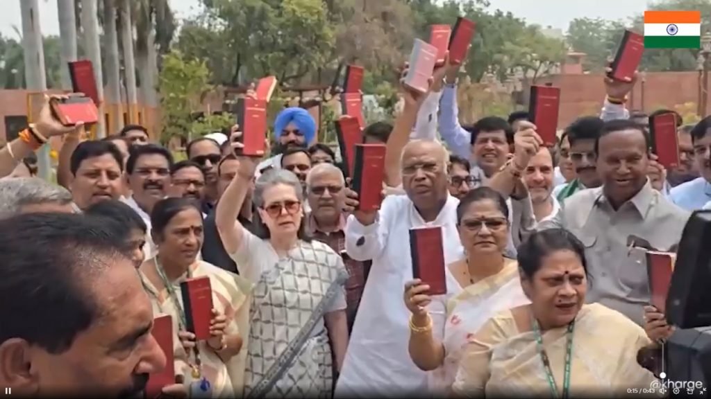 तर काँग्रेस आणि इंडिया आघाडीच्या वतीने संसदेच्या आवारात राज्यघटनेची प्रत हाती घेत निदर्शन मोर्चा काढला. त्यानंतर काँग्रेसचे राष्ट्रीय अध्यक्ष मल्लिकार्जून खर्गे म्हणाले की, पंतप्रधान नरेंद्र मोदी यांच्याकडे १८ व्या लोकसभेच्या प्रारंभापूर्वीच्या त्यांच्या वक्तव्यात काहीही नवीन नव्हते आणि “नेहमीप्रमाणेच मुख्य मुद्यावरून लक्ष विचलित करण्याचा प्रयत्न केला.” आणि गेल्या १० वर्षांची “अघोषित आणीबाणी” होती हे ते विसरले आहेत अशी खोचक टीकाही यावेळी केला.