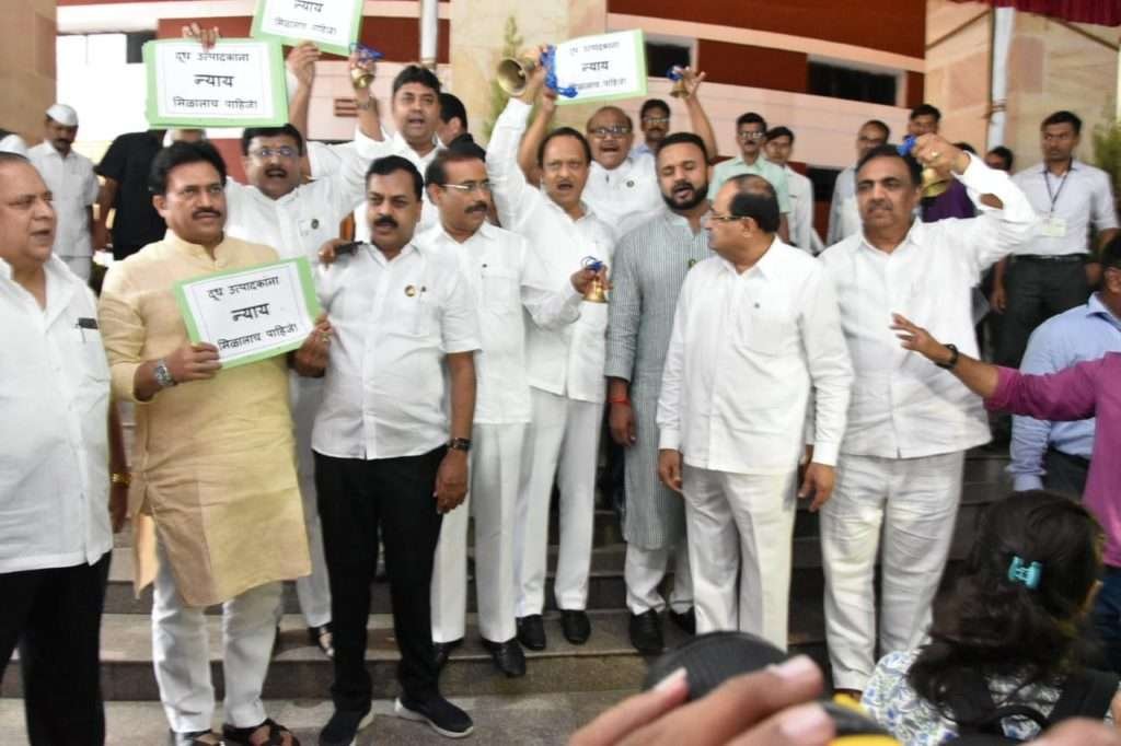 राज्यातील दूध उत्पादक शेतकऱ्यांच्या दूधाला वाढीव दर द्यावा, ५ रूपये थेट अनुदान द्यावे या मागणीवरून विरोधकांनी विधानसभेत सरकारला चांगलेच कोंडीत पकडले. मात्र राज्य सरकारकडून याबाबत तातडीने निर्णय घेण्यास टाळाटाळ सुरु केल्याच्या विरोधात सर्व विरोधकांनी विधानभवनाच्या पायऱ्यावर घंटानाद आंदोलन करत सरकारविरोधी घोषणाबाजी केली. विरोधकांच्या या आंदोलनामुळे विधानभवनाचा परिसर दणाणून गेला.