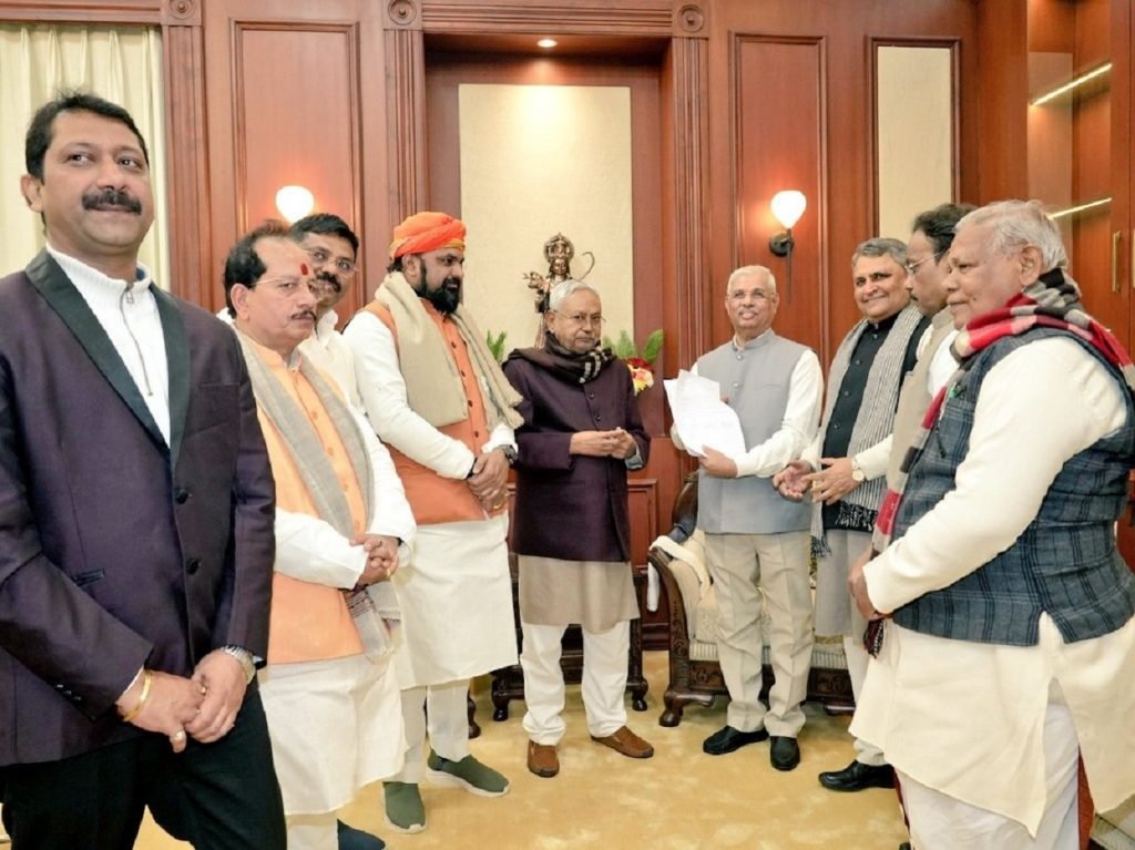 बिहार के महामहिम राज्यपाल श्री राजेंद्र विश्वनाथ आर्लेकर जी से मिलकर माननीय कार्यवाहक मुख्यमंत्री श्री नीतीश कुमार, भाजपा की ओर से विधायक दल के नेता श्री @samrat4bjp एवं उपनेता श्री @VijayKrSinhaBih के नेतृत्व में NDA के नेताओं ने सरकार बनाने का दावा पेश किया। साथ में माननीय… pic.twitter.com/Ci6xMs58Ta