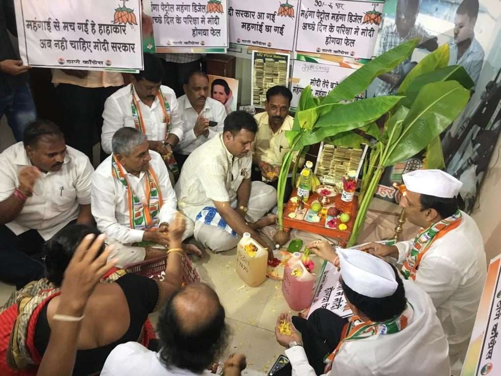 राज्यात अगोदरच नव्वदी पार गेलेल्या पेट्रोलने आज मुंबई ठाणे शहर व परिसरातही नव्वदी पार केली आहे. डिझेलचे दरही प्रति लिटर 80 रूपयांच्या वर गेले आहेत व डॉलरच्या तुलनेत रूपयांची ऐतिहासीक घसरण झाली आहे. याविरोधात मोदी सरकारचा निषेध करण्यासाठी प्रतिकात्मक स्वरूपात काँग्रेस पक्षातर्फे ठाणे येथे अनोखे आंदोलन करण्यात आले. पितृपक्षाच्या पहिल्या दिवशी पेट्रोल, डिझेल आणि डॉलरची साग्रसंगीत पूजा अर्चना करण्यात आली. ॐ पेट्रोलाय नमः।ॐ डिझेलाय नमः।ॐ डॉलराय नमः। अशा मंत्रोच्चारातून मोदी सरकारचा निषेध करण्यात आला. या प्रसंगी बोलताना सचिन सावंत म्हणाले की मोदींच्या नेतृत्वाखाली पेट्रोल लवकरच शंभरी पार करेल. मोदींच्या कतृत्वाने डिझेलच्या दराची वाटचालही शंभरीच्या दिशेने वेगात सुरु आहे. त्यामुळे आता पेट्रोलपंपांना संरक्षण तर द्यावे लागेलच सोबतच पेट्रोल, डिझेलची पूजाही करावी लागेल. सत्तेच्या उन्मादात मोदींना जनतेला दिलेल्या आश्वासनांचा विसर पडला आहे. आपल्या उद्योगपती मित्रांच्या फायद्यासाठी सरकार चालवणा-या मोदींना सर्वसामान्य जनतेचा आक्रोश दिसत नाही. पेट्रोल, डिझेलच्या दरवाढीचा मार सर्वसामान्य जनतेसह शेतक-यांनाही बसत आहे. त्यामुळे या बहि-या सरकारचे कान उघडण्यासाठी काँग्रेस पक्ष सातत्याने संघर्ष करेल तसेच 2019 ला राहुल गांधी यांच्या नेतृत्वाखाली हीच गोरगरिब जनता सर्वसामान्यांचे सरकार आणेल असा विश्वास सावंत यांनी केला.