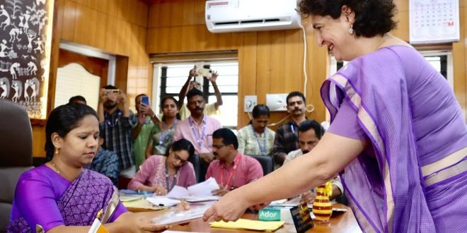 काँग्रेसच्या सरचिटणीस प्रियंका गांधी वड्रा यांनी बुधवारी केरळमधील वायनाडमध्ये लोकसभा पोटनिवडणुकीसाठी उमेदवारी अर्ज दाखल केल्याने त्यांच्या पहिल्या निवडणूक लढतीचा मार्ग मोकळा झाला आहे. कालपेट्टा येथील मेगा रोड शोनंतर प्रियंका जिल्हाधिकारी कार्यालयात गेली आणि जिल्हाधिकारी आणि रिटर्निंग ऑफिसर डीआर मेघाश्री यांच्याकडे कागदपत्र सादर केले. आई सोनिया गांधी आणि पक्षाचे सरचिटणीस के सी वेणुगोपाल यांच्यासह भाऊ राहुल आणि काँग्रेसचे राष्ट्रीय अध्यक्ष मल्लिकार्जुन खर्गेही यावेळी उपस्थित होते. त्याचबरोबर प्रियांकाचे पती रॉबर्ट वाड्रा आणि मुलगा रेहान हे निवडणूक अधिकाऱ्याच्या चेंबरबाहेर थांबले.
