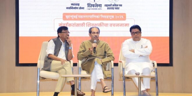 मुंबई महापालिका निवडणूकीच्या पार्श्वभूमीवर शिवसेना उबाठाचे उद्धव ठाकरे आणि मनसे प्रमुख राज ठाकरे आणि राष्ट्रवादी काँग्रेस शरदचंद्र पवार पक्षाचा संयुक्त वचननामा शिवसेना भवनात आयोजित पत्रकार परिषदेवेळी केली. त्यावेळी उद्धव ठाकरे बोलत होते.