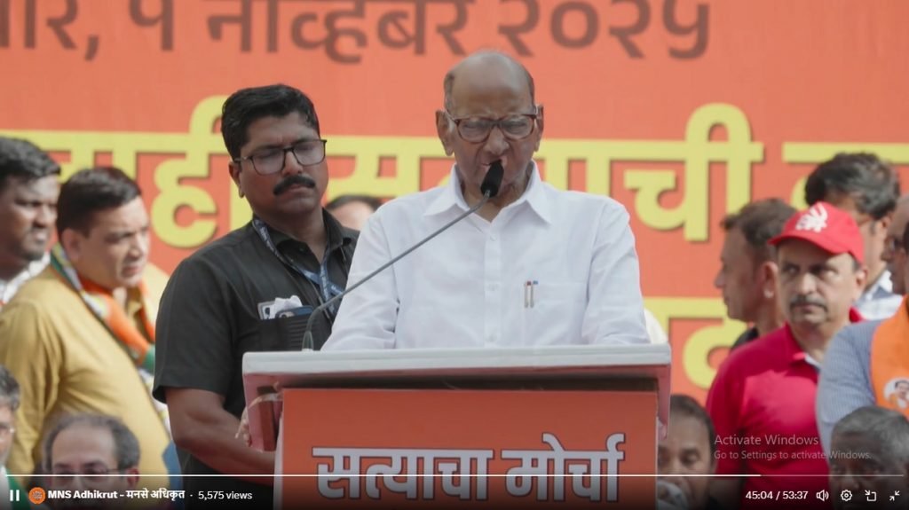 शेवटी बोलताना शरद पवार म्हणाले की, काही ठिकाणी काही लोकांनी तक्रारी केल्या. बनावट आधारकार्ड तयार करून मिळतात अशा त्या तक्रारी होत्या. कलेक्टर म्हणाले की, सिद्ध करा, पुरावे दिले गेले. मात्र ज्यांनी आरोप केला. त्यांच्यावरच गुन्हे दाखल करण्यात आले. याचा अर्थ हे शासन या सगळ्यांला समर्थन देतं आहे. आमच्या विचारधारा वेगवेगळ्या आहेत. पण देशाची संसदीय लोकशाही ही टीकवायची असेल आणि मतदानाचा अधिकार टीकवाचा असेल तर तुम्हाला एक व्हावं लागेल. आज व्यासपीठावर असलेले नेते याच भावनेतून एकत्र आले आहेत. एवढंच मी या ठिकाणी सांगतो असे सांगितले.