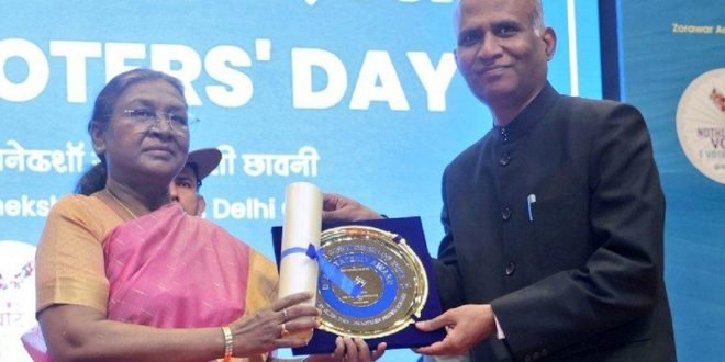 दिल्ली छावणी परिसरातील मानेकशॉ सभागृहात भारत निवडणूक आयोगाच्यावतीने १५ व्या राष्ट्रीय मतदार दिनानिमित्त पुरस्कार वितरण कार्यक्रमाचे आयोजन करण्यात आले होते. कार्यक्रमाच्या प्रमुख अतिथी राष्ट्रपती श्रीमती मुर्मू होत्या. याप्रसंगी केंद्रीय विधी व न्याय मंत्री अर्जुनराम मेघवाल, मुख्य निवडणूक आयुक्त राजीव कुमार, निवडणूक आयुक्त ज्ञानेश कुमार, डॉ. सुखबीर सिंग संधू उपस्थित होते.