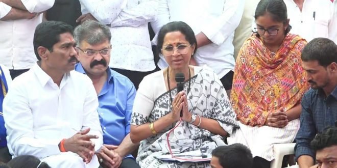 पुढे बोलताना सुप्रिया सुळे बोलताना म्हणाल्या की, आपल्या देशात खंडणी मागणे गुन्हा आहे. वाल्मिक कराड खंडणी मागत होता, तर त्याला आधी अटक का झाली नाही? त्यांना ईडी का नाही लागली? याचे उत्तर सरकारला द्यावे लागेल. मे महिन्यात पहिल्यांदा खंडणी मागितली, तेव्हाच त्यांच्यावर ईडी आणि सीबीआयची कारवाई व्हायला पाहिजे होती. बीड जिल्ह्यात लोकांना वर्दीची भीतीच राहिली नाही. बीडची बदनामी करायचे पाप या पाच दहा लोकांनी केले. तुम्ही सगळे सुसंस्कृत आणि चांगलेच आहात. तुम्ही सुसंस्कृत असल्यामुळेच ते तुम्हाला दम देतात. आता महिलांनी लढाई हातात घेतली पाहिजे, समोर कोणी आले तर घ्या हातात लाटणे आणि ठोकून काढा, असा मी आग्रह करते, असे आवाहनही यावेळी केले.