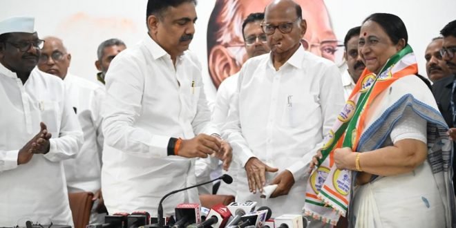 राष्ट्रवादी काँग्रेस शरदचंद्र पवार पक्षाचे राष्ट्रीय अध्यक्ष शरद पवार यांच्या उपस्थितीत माजी केंद्रीय मंत्री सूर्यकांता पाटील यांनी आज पुन्हा राष्ट्रवादी काँग्रेस शरदचंद्र पवार पक्षात जाहीर प्रवेश केला. यावेळी प्रदेशाध्यक्ष जयंत पाटील उपस्थित होते. राष्ट्रवादी काँग्रेस शरदचंद्र पवार पक्ष मुंबईतील पक्ष कार्यालयात पक्षप्रवेश केला.